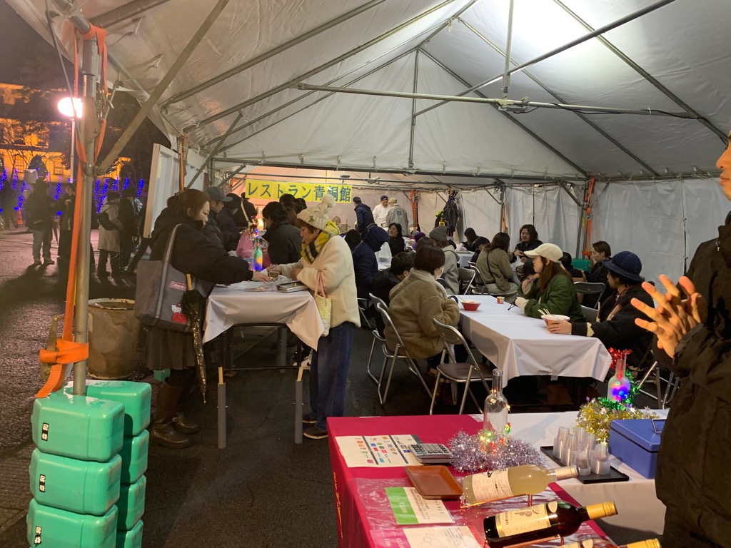 マーケットブースでは、小坂七滝ワイナリーヌーヴォー(ワイン)やあたたかい食べ物、飲み物、クリスマスに関係したグッズの販売などをする店舗が並びます。